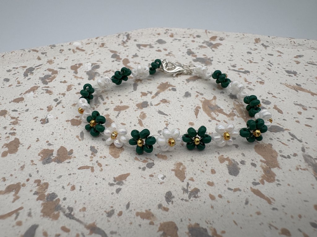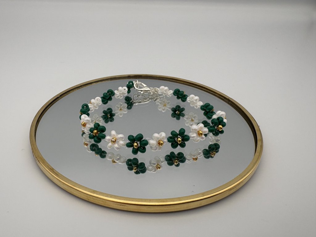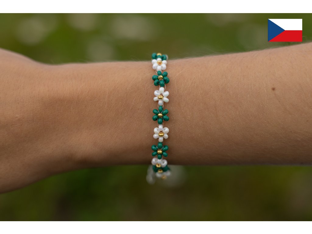 Náramek Chryzantéma spojuje svěžest přírody s jemnou ženskostí. Zelené a bílé korálkové kytičky se zlatým středem působí jako drobné chryzantémy rozkvetlé v ranní rose. Každý náramek je ručně tvořený s láskou a pečlivostí, aby na tvém zápěstí rozkvetl kousek klidu a krásy.