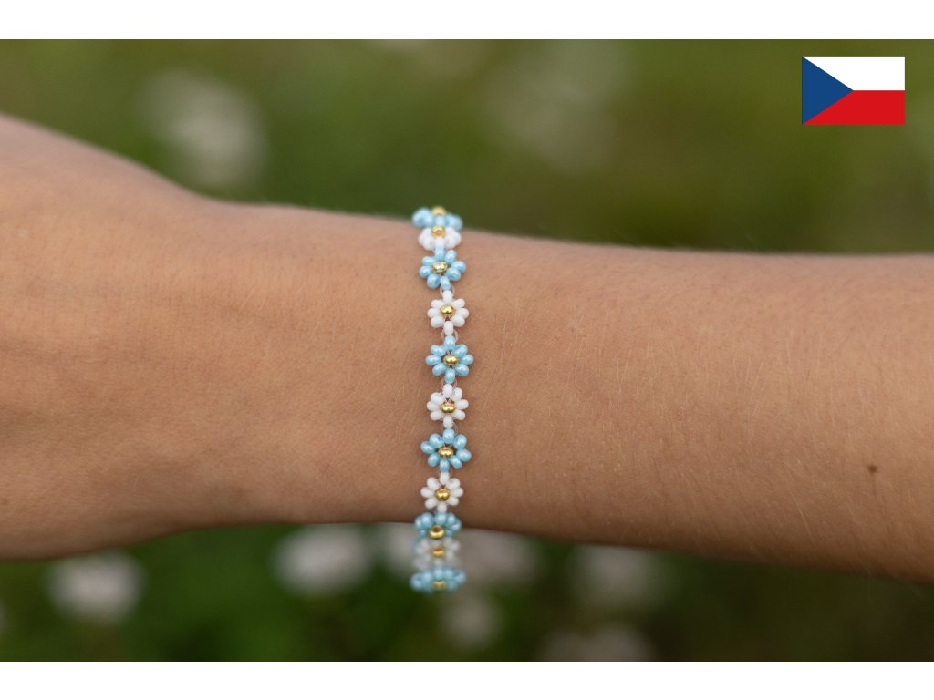 Náramek Pomněnka je symbolem jemnosti, vzpomínek a čistoty. Tyrkysové a bílé kytičky se zlatým středem vytvářejí něžnou kombinaci, která připomíná blankytné nebe poseté malými kvítky pomněnek. Každý náramek je ručně navlečen s láskou a pečlivostí, aby se stal nejen doplňkem, ale i malým talismanem radosti.